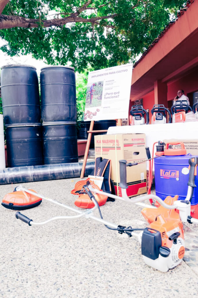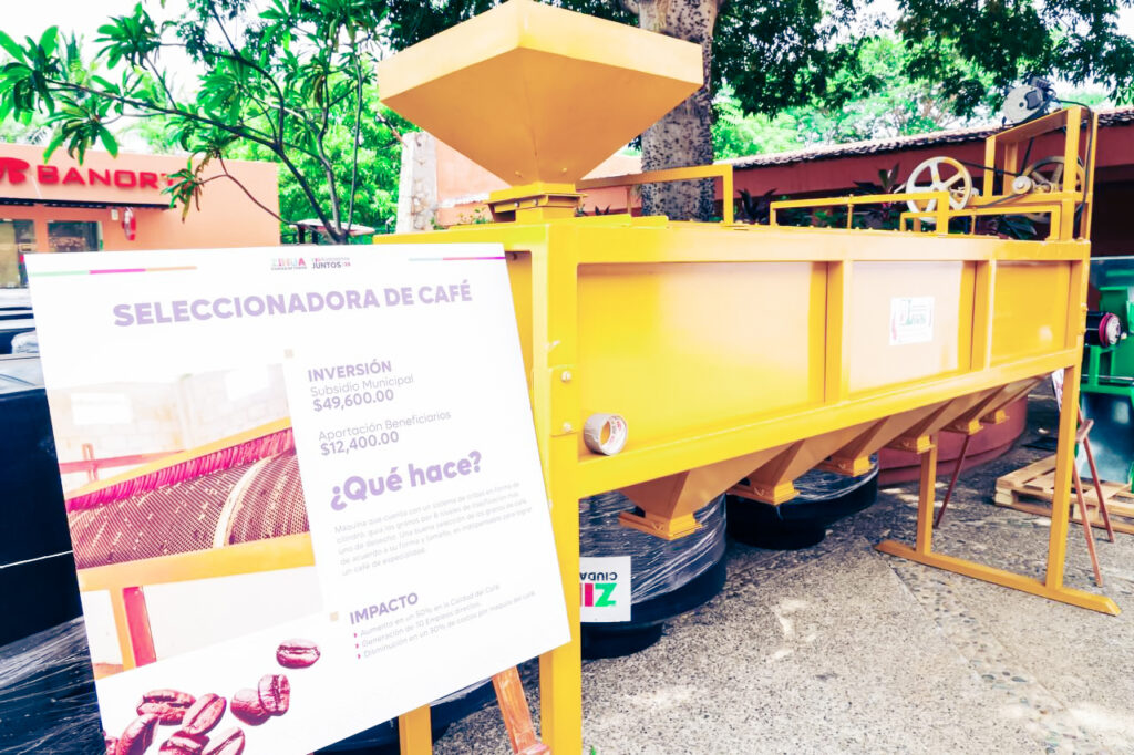 Durante un evento desarrollado en la explanada municipal, se realizó la entrega de implementos para el cultivo de café, molinos, seleccionadoras, empaques, despulpadoras y kids de secado del aromático grano, así como 6 aireadores acuícolas que serán utilizados en una granja de cultivo de camarón.