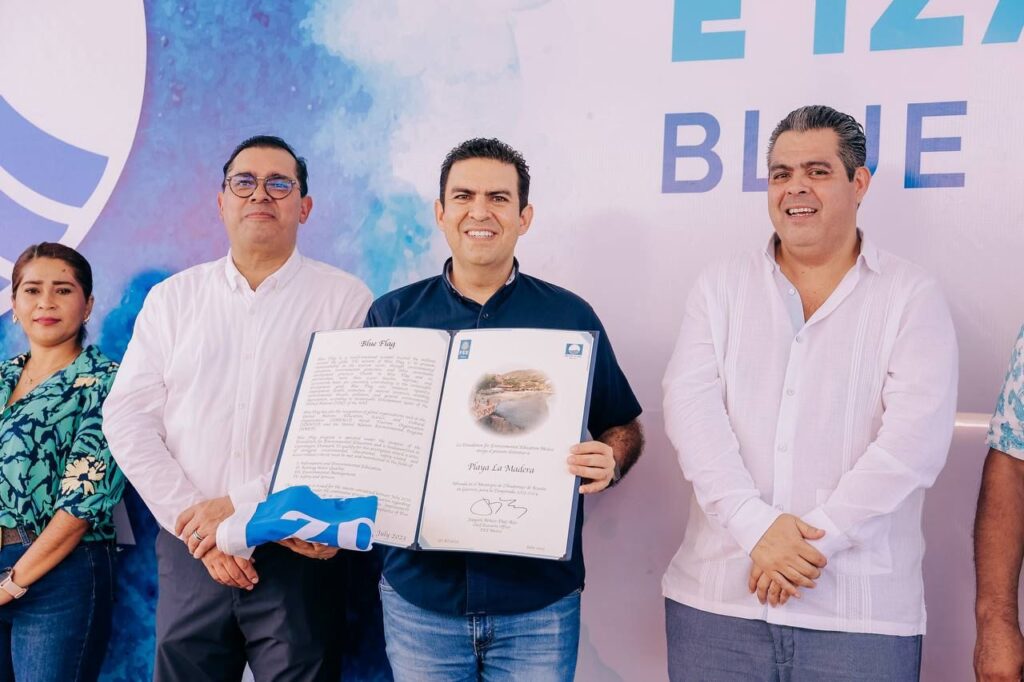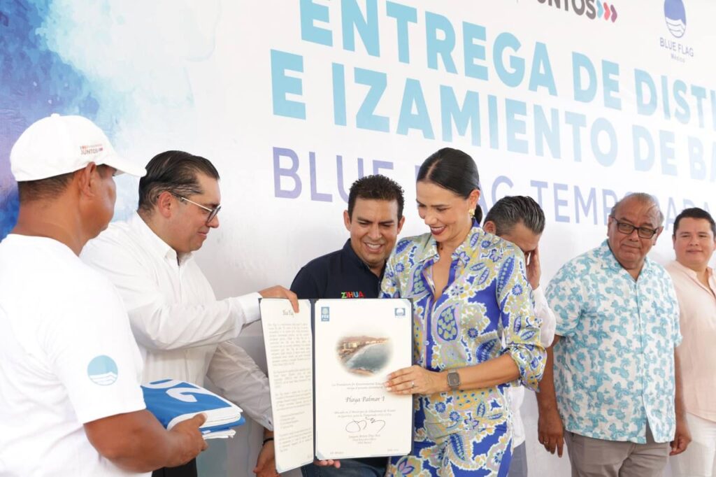 El presidente Jorge Sánchez Allec y el Director Ejecutivo de FEE México, Joaquín Arturo Díaz Ríos, encabezaron el pasado viernes la entrega de los documentos que respaldan la recertificación de las playas El Palmar I, II y II de Ixtapa, así como La Ropa y La Madera de Zihuatanejo, con el distintivo internacional Blue Flag para la temporada 2023-2024.