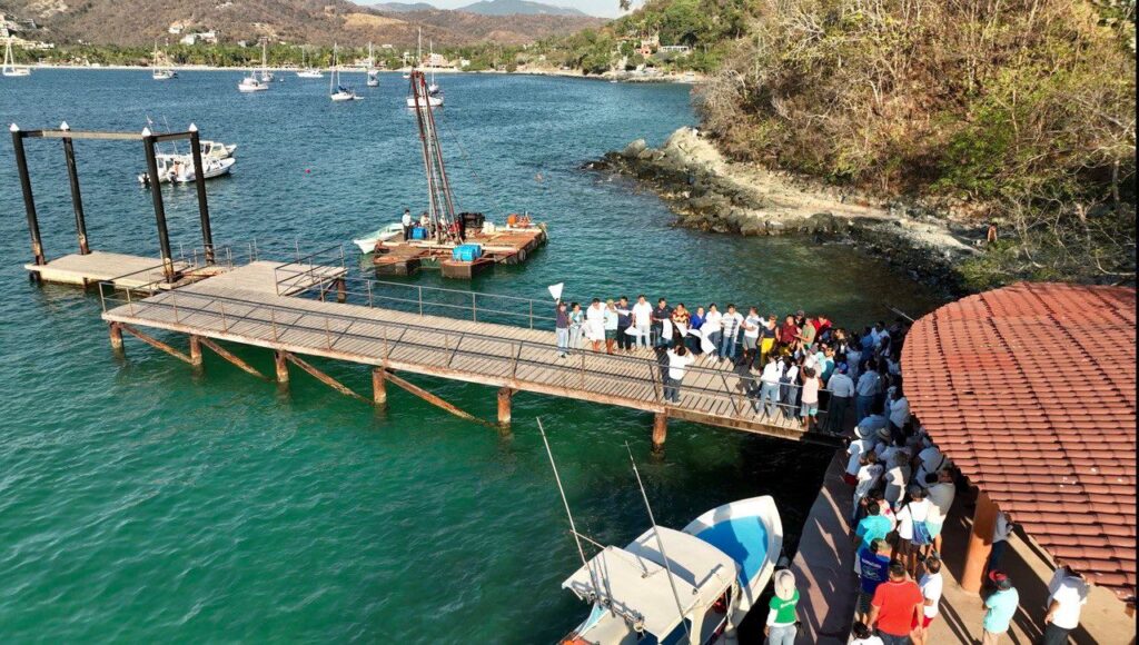 Zihuatanejo, Gro.- 14 de febrero del 2023.- Con el objetivo de seguir fortaleciendo la infraestructura de Zihuatanejo para ofrecer a sus visitantes nacionales y extranjeros las condiciones de seguridad que buscan para tener una estancia placentera en el destino turístico, el presidente Jorge Sánchez Allec, junto con integrantes del Cabildo, representantes del sector restaurantero, prestadores de servicios náuticos y directores municipales, puso en marcha este lunes los trabajos de construcción del muelle de playa Las Gatas.