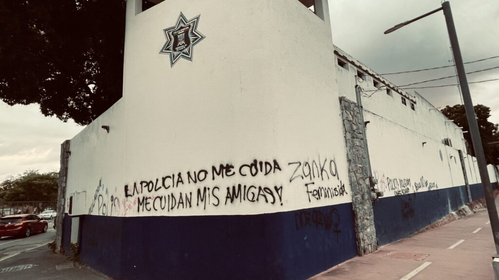 Las mujeres realizaron a su paso varias pintas con pintura en aerosoles como en la Academia de la Policía Municipal, donde pintaron “La policía no me cuida, me cuidan mis amigas”, “Zanka feminista”, “Policia violador”, entre otras pintas.