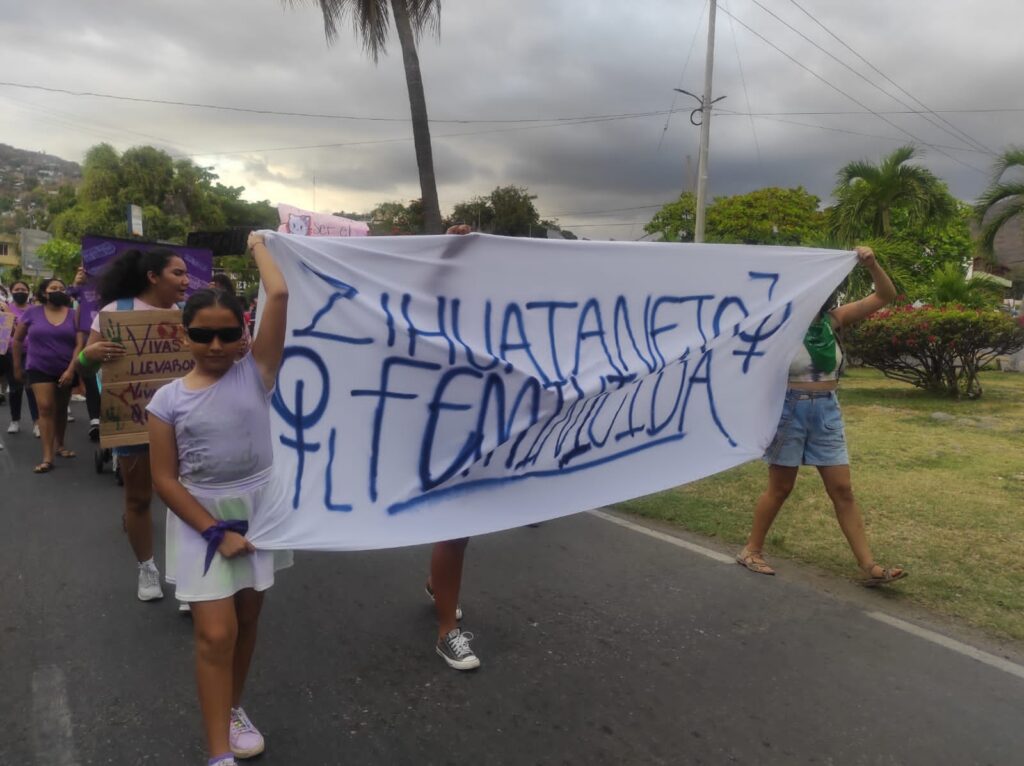 Las mujeres portaban una manta en donde se leía “Zihuatanejo Feminicida”, además de pancartas en cartón donde escribieron “Quiero que mi mamá me ayude a buscar mi vestido de graduación no que la ayuden a buscar mi cuerpo”, además de que iban gritando consignas la culpa no era mía, ni dónde estaba, ni cómo vestía», «El patriarcado es un juez, que nos juzga por nacer y nuestro castigo es la violencia que no ves», entre otras.